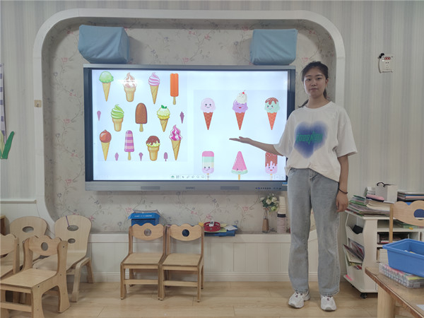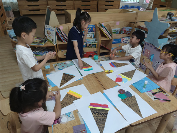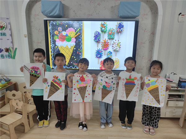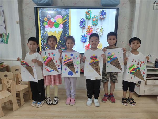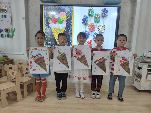 哇!各种各样漂亮的冰淇淋出现在了画纸上,小朋友们还在上面做了好看的装饰,有巧克力棒、马卡龙、小花、巧克力豆……,不一会儿一个个美味的冰淇淋就做好了。