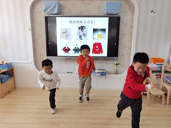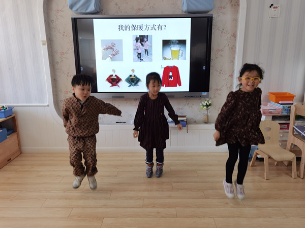 首先,小朋友们通过几张图片了解了感冒发生时有哪些症状。接着就问题“如果感冒了,应该怎么办呢?”大家努力思考,踊跃发言,纷纷表达自己的感冒小妙招。“要看医生”“要多喝热水”“咳嗽时不能对着小朋友”“我知道,我知道,睡觉不能蹬被子”……在了解了有关感冒的相关知识后,小朋友开始思考天冷了,怎样让自己的身体暖和起来呢?有的说穿毛衣,有的说天冷要多喝热水,还有的小朋友说多运动让身体暖和起来,原来有这么多的办法可以让我们的身体健健康康、不生病呢!