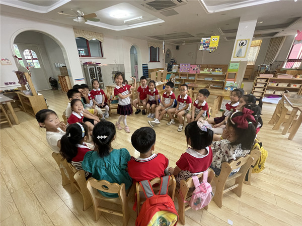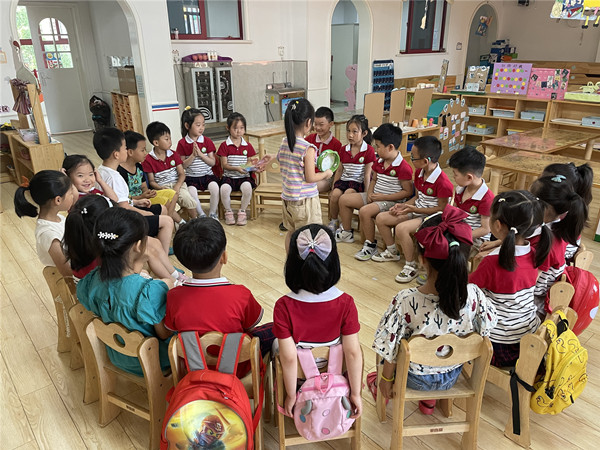 孩子们围成一个圆,只见老师神秘地说:“我们今天来玩个新游戏,击鼓传花。”听说要玩游戏了,孩子们开心极了。“我喜欢玩游戏!”老师随之介绍了游戏规则。紧接着,游戏开始。一个孩子击鼓,其他孩子们快速传花,花儿在小朋友的手中快速奔跑着。鼓声停,花落到谁的手里,谁就要给大家展示一个小才艺。游戏正如火如荼地盛开着。