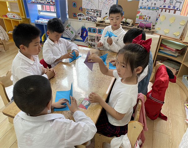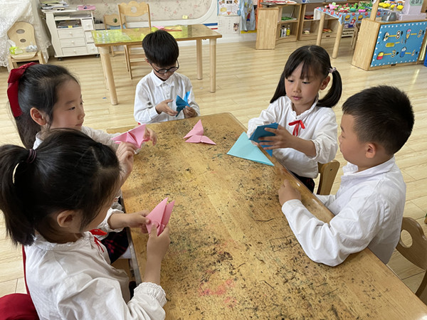 一张张普普通通的纸,孩子们在操作中不仅仅发展了幼儿的动手能力,想象力与创造力,而且在折纸的时候,常常会与其他小伙伴还有老师进行交流,不仅增加了朋友间的友谊,也发展了孩子的表达能力。