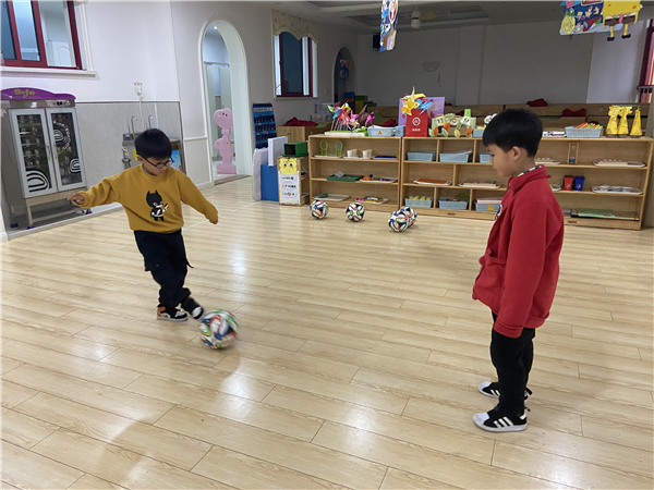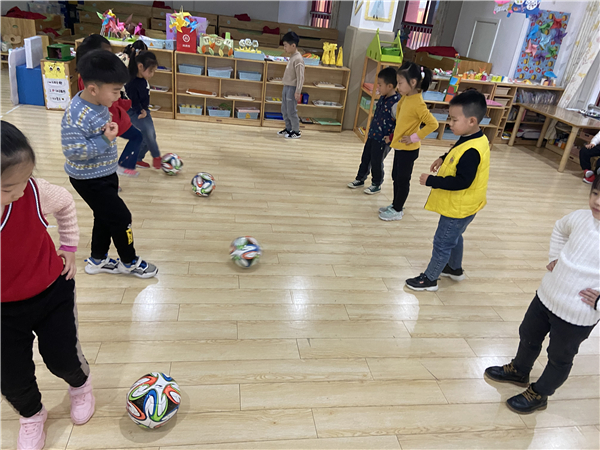 活动中,老师主要以游戏的形式带领孩子们一起进行足球运动,并耐心地给每一个孩子进行指导,同时向小朋友们演示踢球、运球等基本动作,让孩子们能更快更好地掌握。孩子们也在老师的带领下,一步步练习,并开始逐步领略踢球、控球时的动作要领。