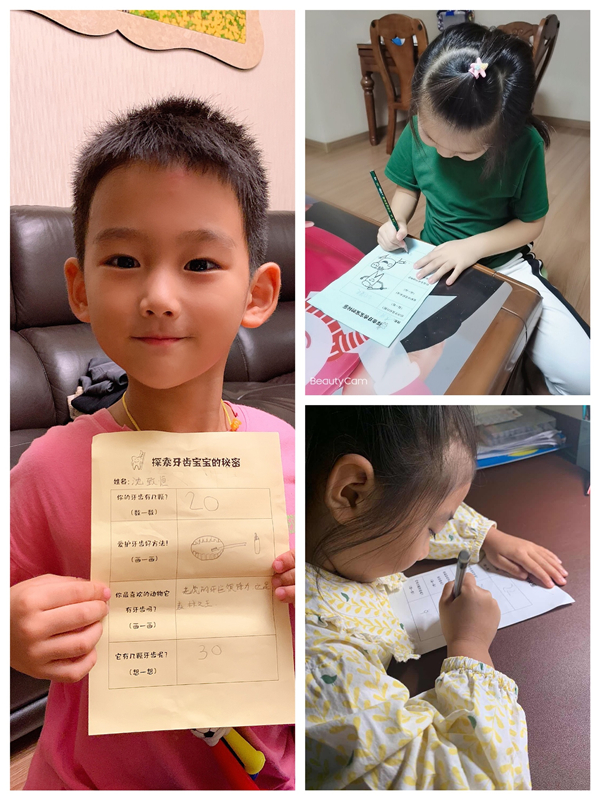 “小牙刷,手中拿,我们一起来刷牙。上牙往下刷,下牙往上刷……”一首好听的儿歌《刷牙歌》引发了孩子们对牙齿的好奇心。在晨间的谈话活动中,孩子们你一言我一语的说到:“你知道我们有多少颗牙齿吗?”,“小动物们也有牙齿吗?”,“都有几颗呢?”……为了让孩子们更好的探索其中的奥秘,班级老师制作了“探索牙齿宝宝秘密”的调查问卷,让孩子们在数一数、画一画、想一想中寻找答案!