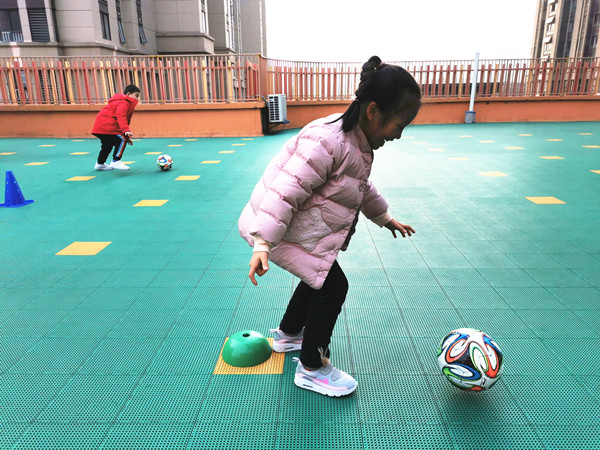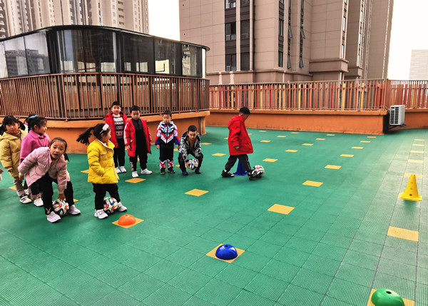 幼儿园的塑胶场地,是孩子们踢球的好场所,孩子们可以放心大胆地玩球,不怕摔、不怕跌,摔倒了再爬起来。在足球“带球障碍跑”的游戏过程中,孩子们的自护意识和自护能力也渐渐增强呢!