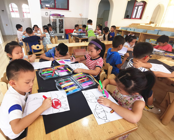 活动开始,小朋友们拿着彩笔、油画棒在各自天地间尽情发挥自己的想象和创造力。色彩斑斓的鱼儿、憨态可掬的海豹、大鲨鱼、大海龟等海洋生物,在孩子们的画笔下栩栩如生。丰富多样的海洋生物仿佛在水里游弋,熠熠生辉。