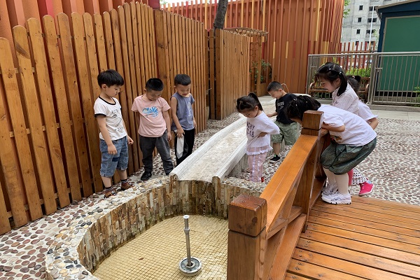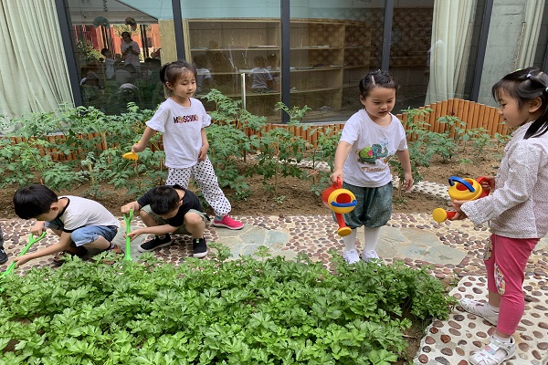 一进入小菜地,他们就被“流动的水”吸引住了!打开水龙头,水流缓缓流动,温婉地水流像轻纱般又倏地流入水池中,孩子们兴奋地喊着:“水流下来了,像滑滑梯一样呢!”紧接着,孩子们带着工具来到菜地,孩子们惊奇的发现:空心菜已经冒芽了;辣椒藤上也长出了小辣椒;黄瓜藤上的小黄瓜真露出新鲜的黄花;远处一片绿油油,那是什么?原来是一片芹菜……孩子们迫不及待地伸着脖子闻了起来,伴着蔬果的清香,孩子们忙着给蔬菜浇水、松土、除草……忙得热火朝天。