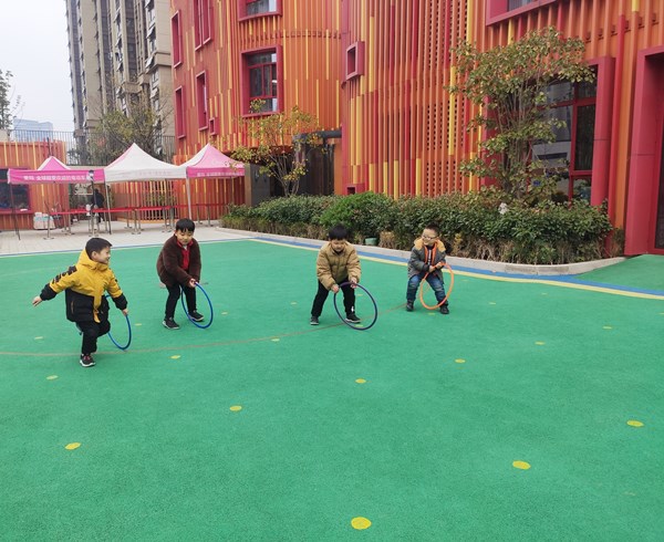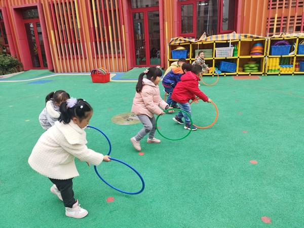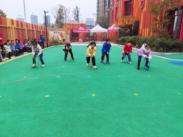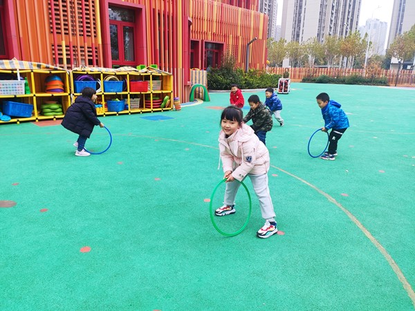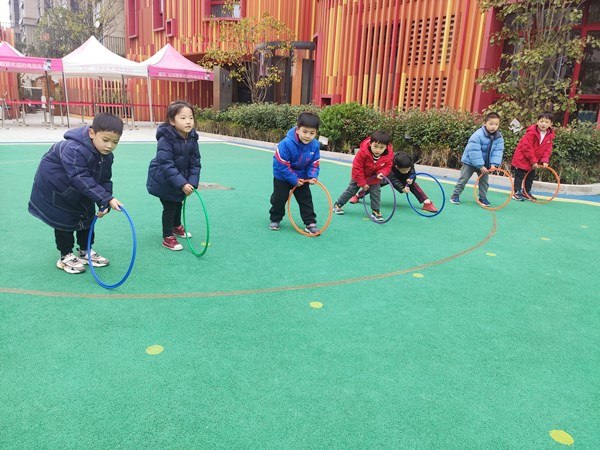 热身活动后,老师讲清楚“风火轮”游戏规则,小朋友们都很兴奋,迫不及待的想大展身手。活动中,一声令下,比赛正式开始,孩子们推着呼啦圈前进,此起彼伏的加油声和欢快的笑声充斥着整个操场。