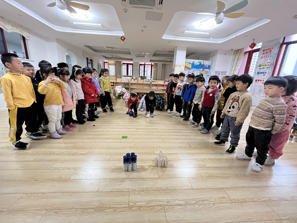活动开始前,老师为幼儿讲解了游戏规则,幼儿两两比赛,依次把手中的“保龄球”滚向“瓶子”,每名幼儿玩两个回合,两次倒下的“瓶子”总数多者为胜。随着老师的一声“开始”,孩子们赶紧把手中紧握的“保龄球”滚了出去,“耶,我一共推倒了8个瓶子。”“我推倒了6个。”孩子们玩地不亦乐乎;接下来是男女生团体比赛,男生队个个信心十足,女生队也不甘示弱,都想赢得比赛胜利,最终男生队凭借自己强大的力量优势获得了最终的胜利,欢呼声此起彼伏!