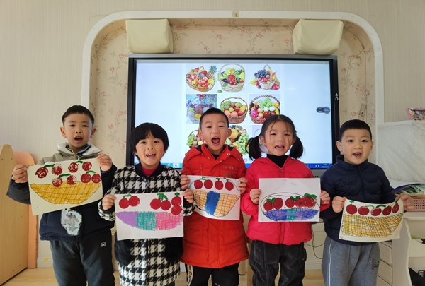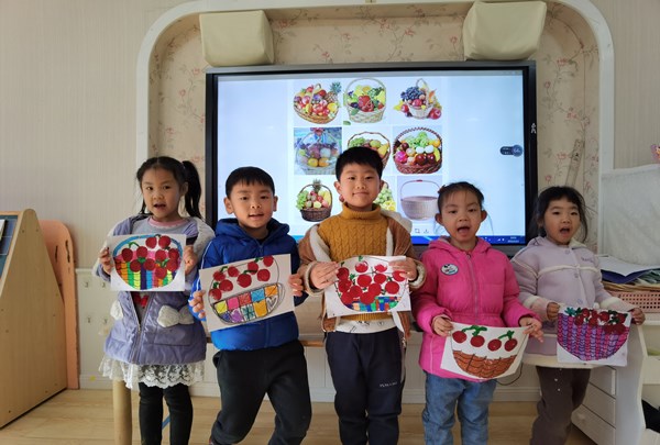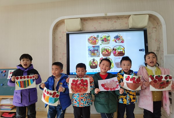 活动开始前,老师和小朋友们一起欣赏了果篮的图片和水果拓印画的作品,了解了果篮的外观特征,丰富了幼儿的前期经验,充分激发了幼儿参与拓印画的兴趣以及想象力。随后老师把调好的颜料按组发放到桌子上,小朋友们开始肆意创作。瞧!孩子们将一个个小海绵蘸上红颜料拓印在水果篮的纸上,摇身一变,成了一个个又圆又红的小苹果,还用画笔蘸上绿颜色给每个小苹果添上小柄,水果篮里的小苹果看起来可真可口。