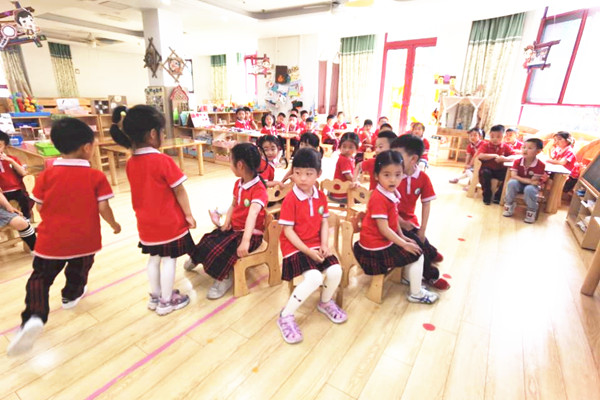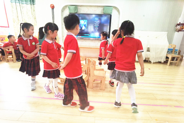 伴随着音乐声响起,游戏开始啦!小朋友们围着椅子转,小眼睛目不转睛地盯着椅子看,耳朵也竖的高高的仔细听音乐有没有停。音乐停止时小朋友要迅速找到一张椅子座下,没有抢到的小朋友即被淘汰。小朋友们的速度之快,动作之敏捷,仿佛比运动健儿们都矫健呢!