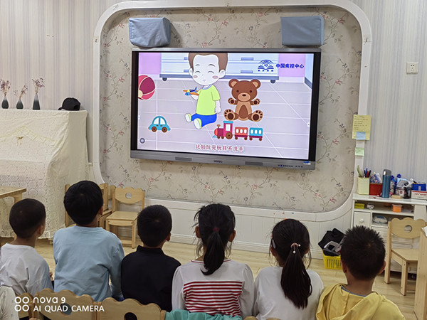 活动开始幼儿一起温习观看开学前第一课《如何预防新冠肺炎》(幼儿园篇)视频,知道坚持科学戴口罩、勤洗手、勤通风,多锻炼、多吃蔬菜水果增强抵抗力,尽量减少聚餐聚会和走亲访友,非必要不前往人员密集的场所。再次温习《预防新冠肺炎儿歌》,重点让幼儿温习科学按照七步洗手法洗手,科学佩戴口罩,戴口罩前洗好双手,用口罩盖住口罩,确保面部和口罩之间没有缝隙,取口罩时请勿触摸口罩正面,如果口罩被汗水润湿,防护效果会“大打折”,应及时更换。上下学中戴好口罩,做好防护。