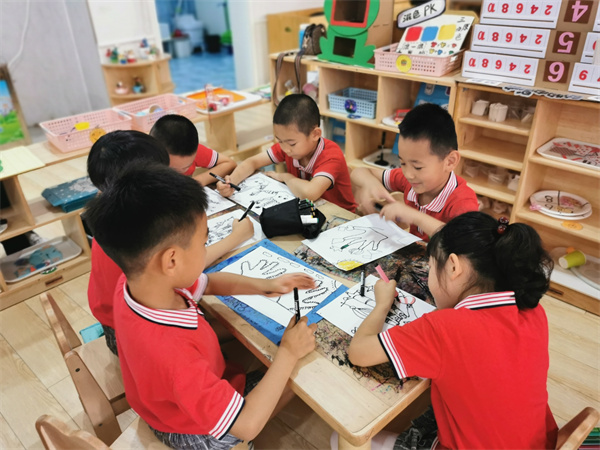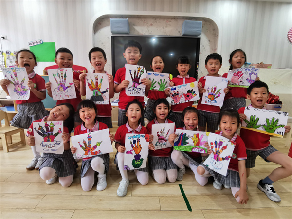 孩子们自主探索,友好合作。在经过一番讨论之后,确定了每组的绘画主题。有房子组、有仙人掌组、有五指小人组,各种创意画跃然纸上,生动形象。“老师,我画好了,我的房子可以住所有的小朋友。”“老师这是我画的手指城堡。”天马行空的想象飞舞在孩子们的手掌上,肆意绽放。