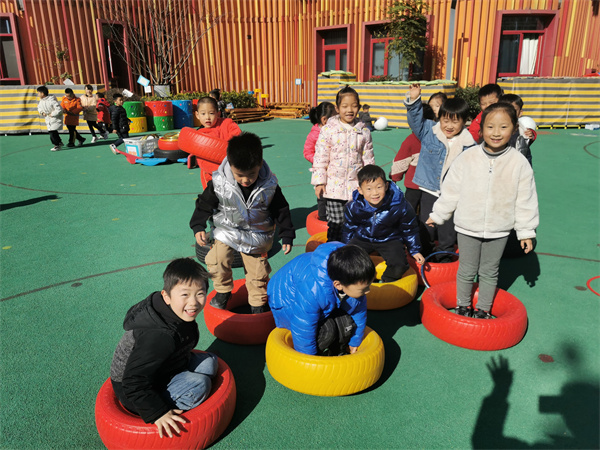 在老师们的带领下,孩子们纷纷来到户外场地,选择自己喜欢的体育器械进行活动:跳绳、轮胎、呼啦圈、皮球……活动中,孩子们自主互助、专注投入、欢呼雀跃、快乐无比。呼啦圈小火车、轮胎打地鼠等各种游戏让整个户外场地上笑声不断。