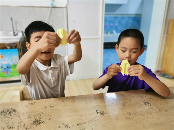 活动中,先引导幼儿通过观察图片了解蝉的生活习性;再出示蝉的折纸步骤图,介绍需要用到的材料;接下来就是小朋友们动手折啦。看,他们都在争当折纸小达人呢!“老师,看我的蝉,我是第一个折好的!”“老师这是我的蝉!”就这样,一只只美丽的蝉就这样出现在了我们的面前。