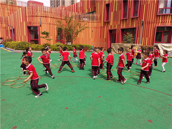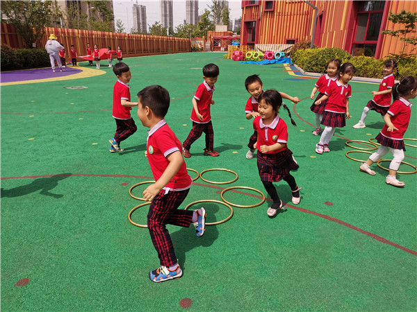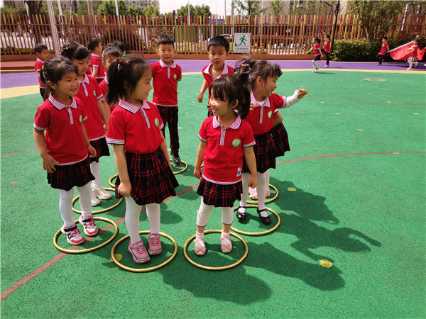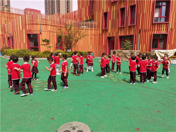 在欢快的氛围中,孩子们随老师一起来到了操场进行抢阵地游戏,孩子们跟随音乐一起来活动身体,围着转,音乐一停就要抢占属于自己的阵地。孩子们开心地玩耍,肆意地大笑。