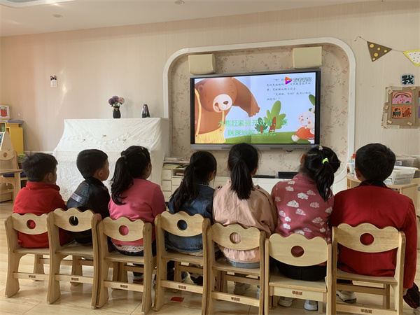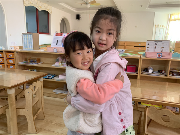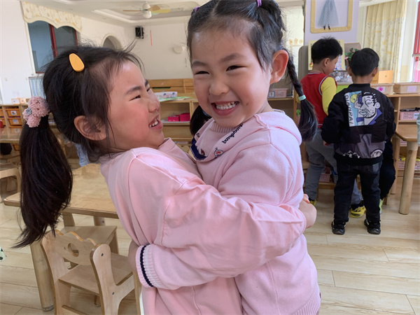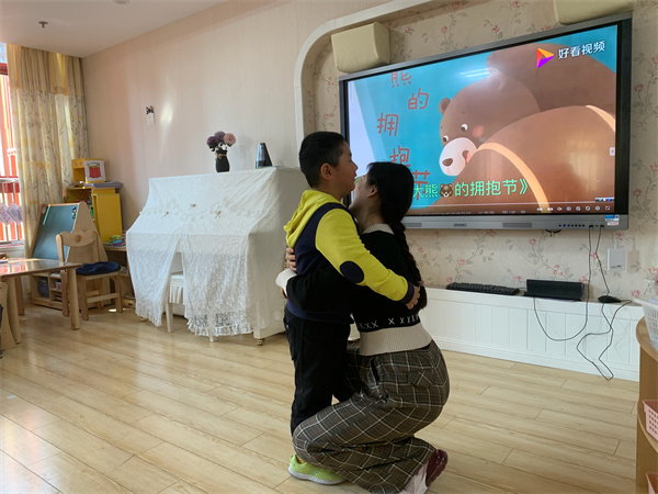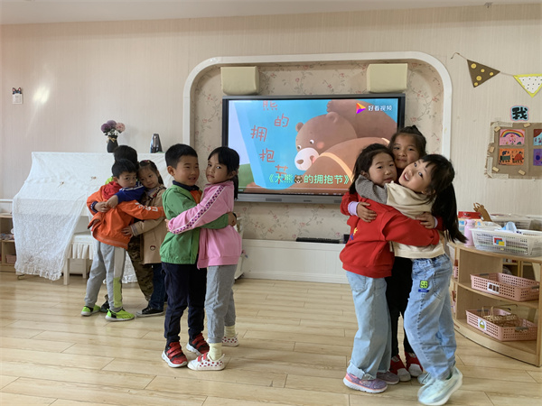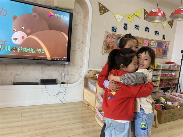 活动中,师幼共同阅读绘本故事《大熊的拥抱节》,并在老师的引导下幼儿边讲述故事边表演游戏,体验了大熊和小动物之间的情感发展,了解了拥抱的含义,懂得相互宽容与珍惜的意义。欣赏完绘本,幼儿纷纷表示想要和自己的好朋友抱一抱,“上次是我不对,我不该抢你的玩具,你能原谅我吗?”“当然原谅你了,我们还是好朋友呀!”说完,他们又紧紧地拥抱在一起。老师也和小朋友们抱一抱,共同体验交朋友的乐趣。