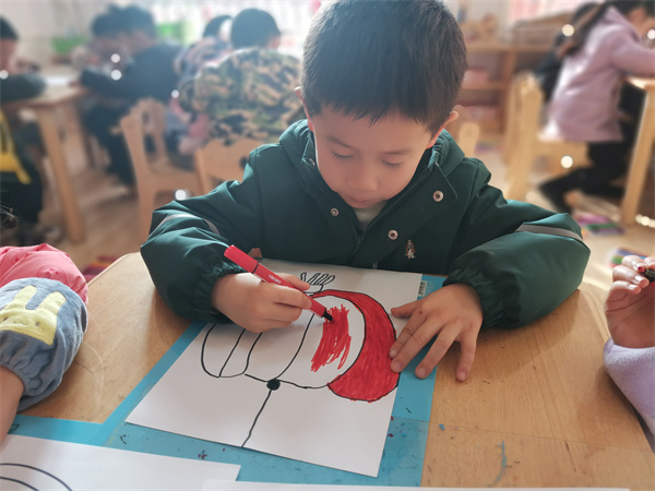 浏览了各式各样的大红灯笼丰富经验以后,孩子们纷纷拿起画笔设计起了自己的大红灯笼:有的小朋友用黑色的水彩笔画轮廓当做骨架,有的在灯笼上画上好看的花纹装饰,还有的在画好的灯笼周围用荧光色让灯笼“亮”起来。大家边画边和身边的小伙伴交流着自己的设计,一片热火朝天,颇具年味。