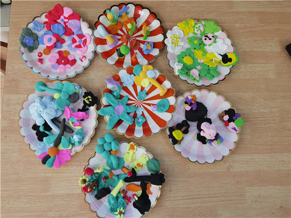 走进花园阵阵花香扑面而来,老师引导孩子们观察花朵的特点,闻闻花的淡淡清香,并引导孩子们通过各种感官感知花的形状、造型。回到教室后,孩子们在老师的指导下利用轻黏土,采用撮、团、压等方法,大胆想象,创作出了许许多多美丽的作品,瞧!一朵朵花儿在纸盘上绽放,真漂亮呀!