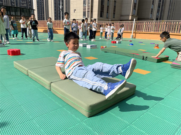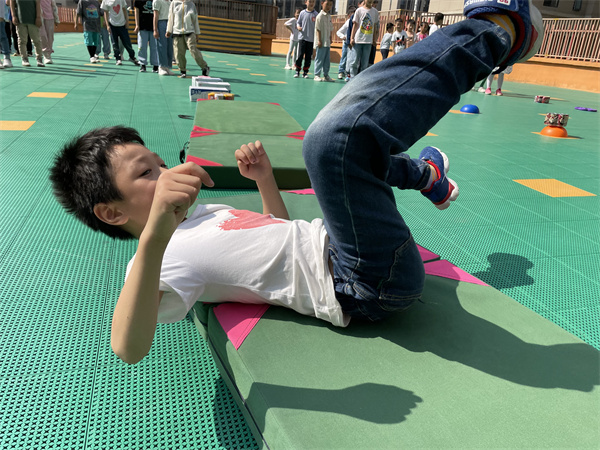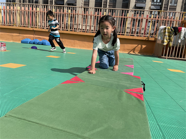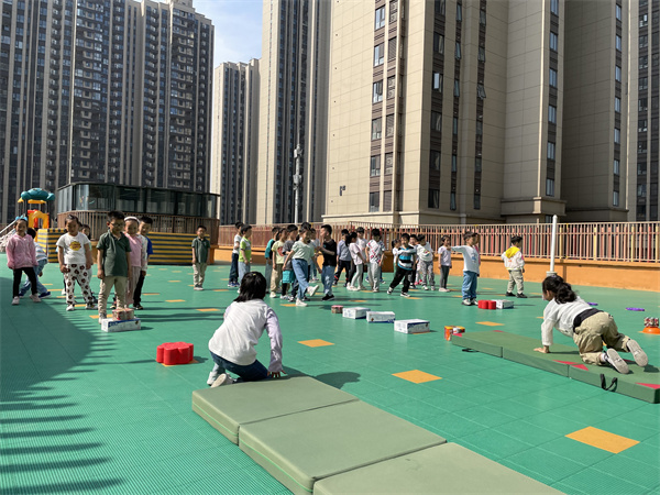 活动开始前,在教师的带领下幼儿先做了热身活动。接着孩子们熟练地分组后开始选择今天游戏需要的材料了,并开始布置今天的闯关内容。快乐的一天就这样在运动中开始了,孩子们时而钻爬、时而跳跨,时而翻滚,玩地不亦乐乎!