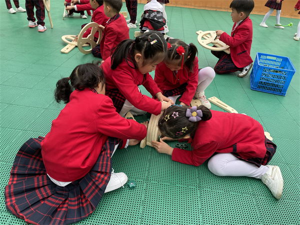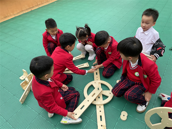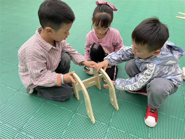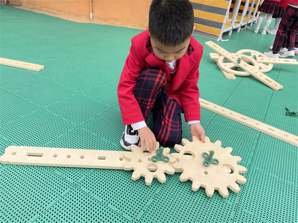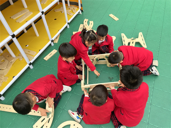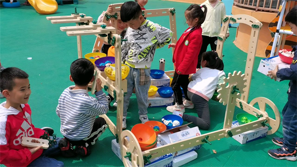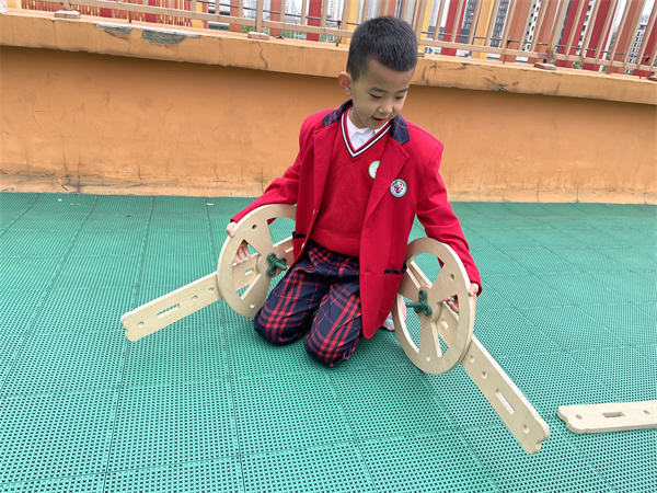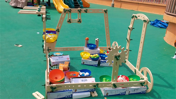 瞧,孩子们分配好了任务,有的独自组装着冰淇淋车上的小零件,有的几人合作组建冰淇淋车的底盘、遮阳棚、售卖台等。