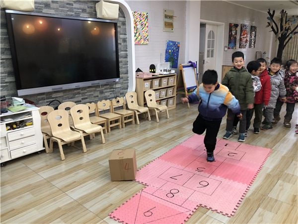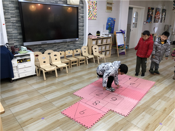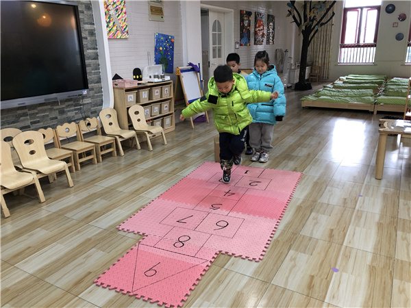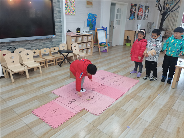 跳房子也叫跳方阵、跳方格,是经典的传统民间体育游戏之一,其玩法多种多样。可随着时代的进步、社会的发展,这种游戏正慢慢地被遗忘。为了让孩子们也能感受到传统民间游戏的趣味,2022年1月6日上午,合肥市大西门幼儿园教育集团森林城分园大四班的孩子们在老师的组织下开展了民间游戏“跳房子”。