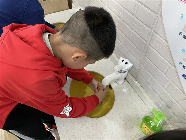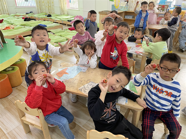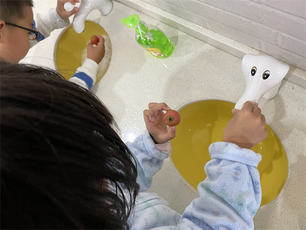 在幼儿园里的山楂成熟了,老师和孩子们一起高高兴兴采山楂。采好山楂后,孩子们有序地排着队每人拿一个山楂去清洗,搓一搓、洗一洗,每个小朋友都认真清洗着。随后在老师的帮助下孩子们拿起切开的山楂闻一闻,感受山楂的气味。并满怀期待地咬了一口,发现了山楂的味道是酸酸的,还有一点甜甜的,孩子们笑成了一团。