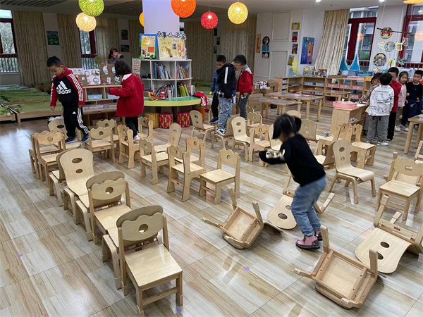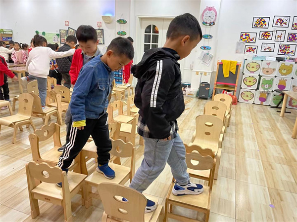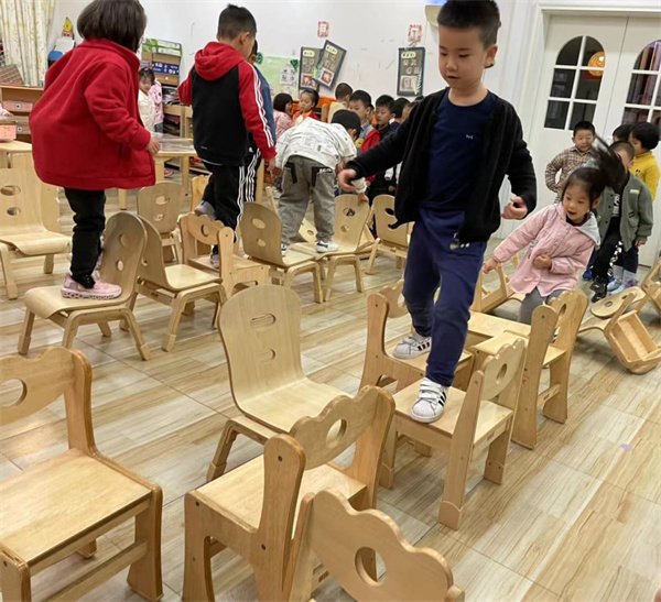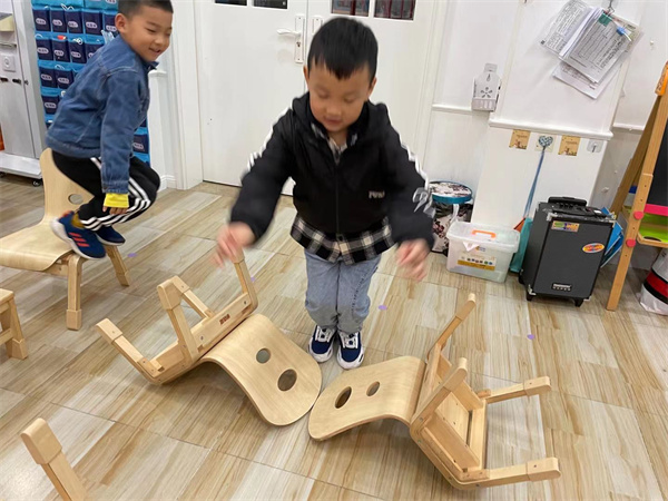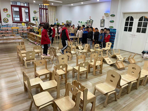 因降雨原因孩子们不能去和户外做活动,在老师的指导下,孩子们有序地用自己的椅子搭建出了一条蜿蜒曲折的“山坡”。