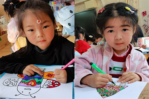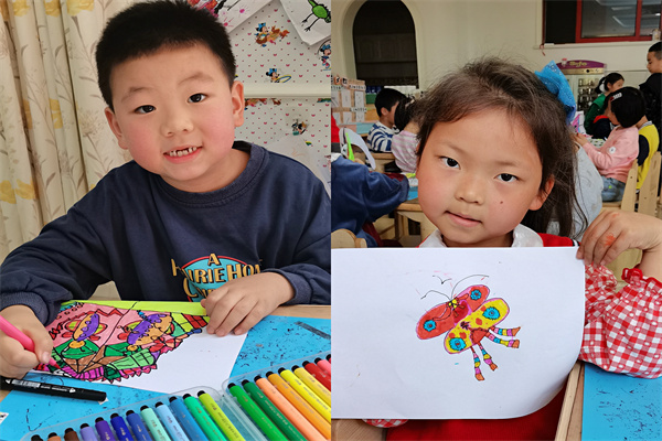 绘画前,教师们为孩子们准备了水彩笔和风筝纸,并给孩子们观看了各种各样的风筝图片,引导幼儿观察图片,然后鼓励幼儿大胆自由地创作自己的风筝。慢慢的一只只美丽的风筝就被创作出来了。瞧!有的在风筝上画了小花和小草,有的在上面画了彩色的点点,还有的在上面画了美丽的太阳和彩虹。