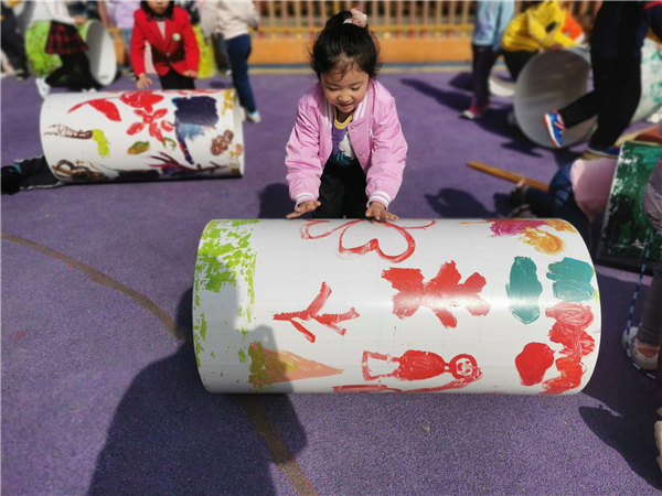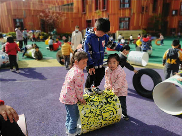 圆圆胖胖的滚筒该怎么玩呢?孩子们先自由结伴一起讨论滚筒的不同玩法,随后和老师一起探讨确立了安全游戏规则后,来到一楼户外场地进行滚筒游戏。他们有的一起推着滚筒向前走;有的钻进滚筒,其他的小朋友推着走;还有的在不断探索尝试站在滚筒上的方法。大家玩地热火朝天,个个脸上笑开了花。