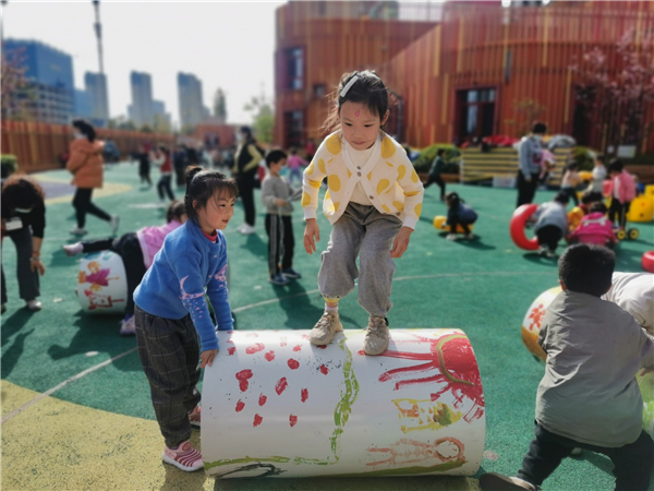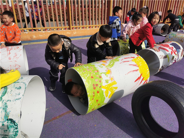 孩子们在滚筒自主探究的过程中,逐渐感知到滚筒的特性,并发现滚筒的奥秘,随之对滚筒游戏的兴趣越发浓厚,从站不上滚筒到单脚跪站立几秒,从一人站在滚桶上到两人一起合作站上滚筒;从单一玩法到借助辅助材料大胆游戏,孩子们的游戏经验得到了不同的提升。