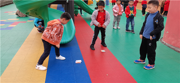 好啦,接下来看孩子们摔方宝比赛啦!比赛开始,孩子们快速找到自己的好朋友,比一比看谁的方宝更厉害。两个人先猜头家(石头、剪子、布)然后拉开阵势,输的一方将自己的方宝放在地上,赢的一方则用力将自己的方宝摔向地面,如果把对方的方宝煽翻过面来,那么方宝就归自己了。如果没煽翻,对方则捡起自己的方宝,重复刚才的动作。游戏开展如火如荼,每个孩子沉浸其中。