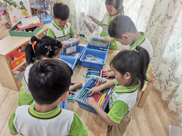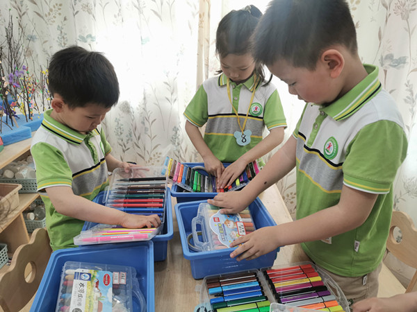 针对孩子们学具盒乱糟糟的现象,小朋友们提出了 “怎样让学具盒不乱”的问题,老师先组织大家一起讨论计策,孩子们纷纷说出 “用完后要整理”、“要把物品整齐摆放在盒子里”、“用完的笔要盖上盖子放在笔盒里”等方法,“可是总有小朋友不记得整理怎么办呢?”老师接着提出了疑惑。在大家的反复讨论中,我们一起设定每周五为我们班的“整理日”,小朋友们在这一天可以互相提醒整理自己的物品,并互相交流、欣赏各自整理的方法和结果,同时发现自己的哪些学具用完了需要更换,养成自我检查、及时更替的好习惯。