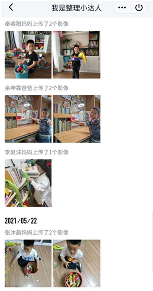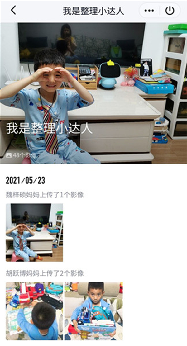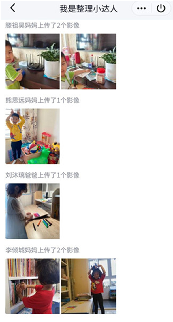 其次,好习惯的养成还需家园共同合作,于是,老师在班级群里也布置了相应的整理任务,建议家长每周末上传孩子在家整理物品的照片至班级群“我是整理小达人”的相册,激发家长与孩子养成良好整理物品的习惯意识,为孩子今后的学习与生活奠定良好的基础。