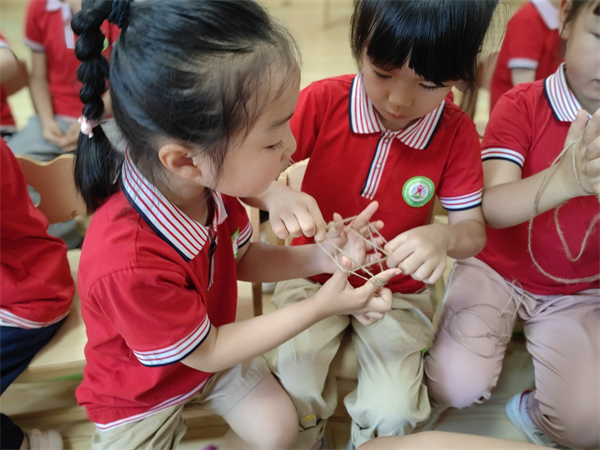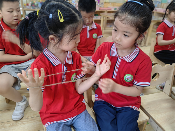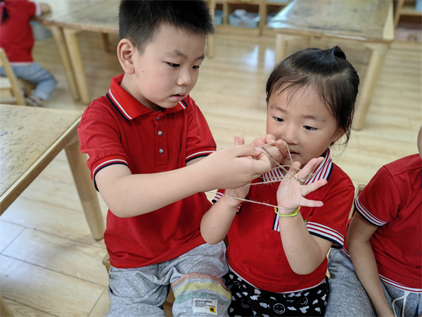 瞧!小朋友们三三两两地围坐在一起,拿出了一根绳子,和小伙伴们在一起游戏啦!利用左右手的协调配合,并通过撑、压、挑、翻、勾等一些精细的动作,灵巧的小手翻来翻去,一根简单的绳子就变化成各种生动有趣的造型图案,十分神奇。