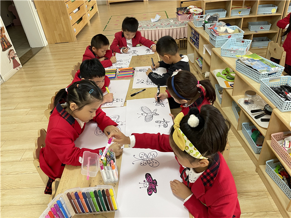 随后,孩子们通过运用记号笔、水彩笔绘画了起来。小朋友们先用记号笔在纸上勾勒出蝴蝶的形状,然后用水彩笔绘画蝴蝶的颜色和图案。不一会儿,一只只蝴蝶飞舞起来。