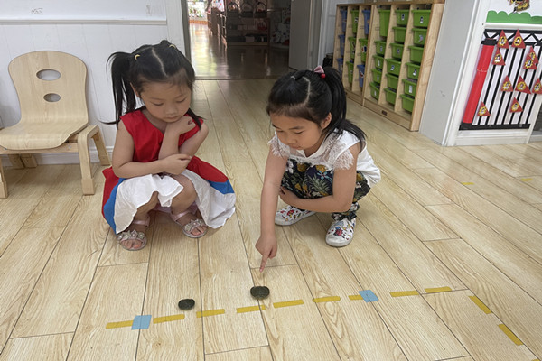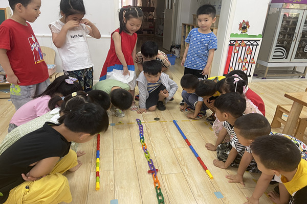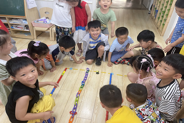 孩子们将乌龟放在一起,为它们呐喊加油,可是任凭孩子们怎么喊,乌龟们依旧缩在壳里不出来,徐茗煊说:“一定是我们太大声,吓到他们了。”同伴们听到后纷纷同意,并捂紧了小嘴巴。等了一会儿,终于有一只乌龟慢慢地伸出脑袋和手脚,开始往前爬,孩子们惊喜极了,都围过去小声为它加油。