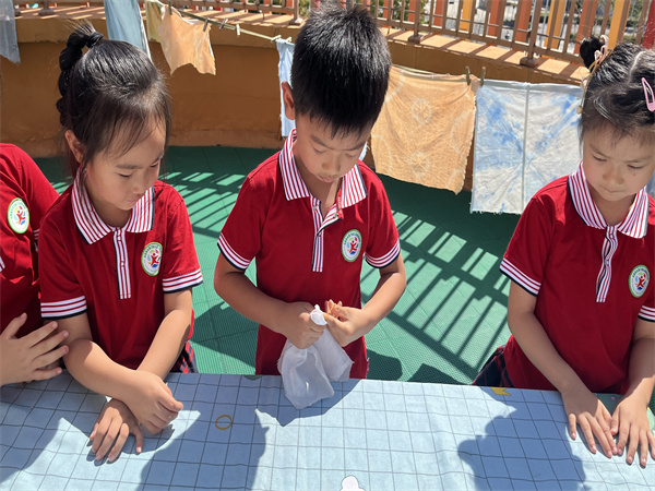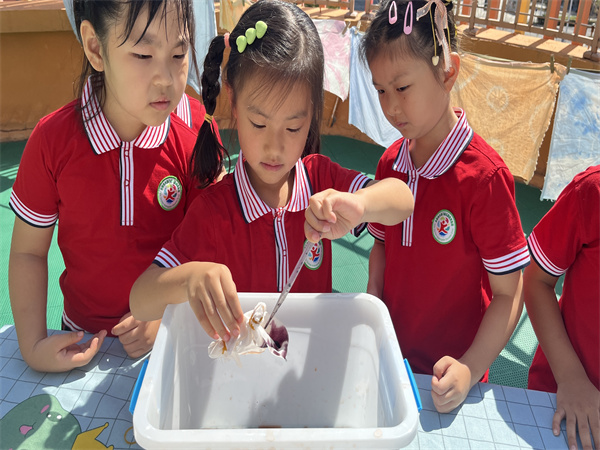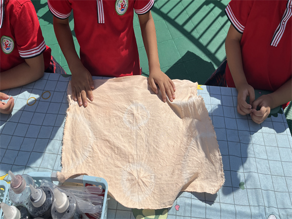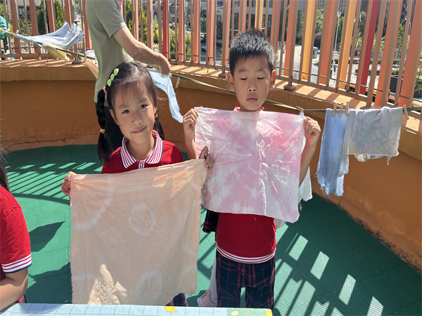 扎染手工制作过程,不但能锻炼孩子们的动手操作能力,而且在对颜色颜色的搭配与印染中,提高了孩子们的审美能力和鉴赏水平。看!小朋友们给白色的布增添了五彩的颜色。