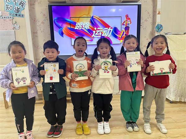 兴趣是最好的老师。孩子们在愉悦的气氛中学习,才能唤起强烈的学习欲望,调动起学习跳绳的积极性和主动性。孩子们和同伴们一起分享平时在跳绳活动发生的趣事,还将跳绳时的样子和跳绳的故事记录下来。比如:小女孩的头发飞起来了、我要和妞妞比赛、我能单脚跳等,跳绳故事的表征记录让孩子们更加喜欢跳绳运动。