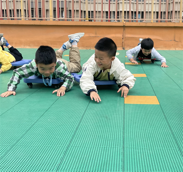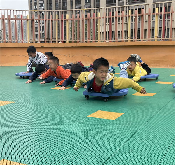 快看,小朋友们很快掌握了使用滑板车的方法,开始了小组游戏,利用手部力量,控制平衡向前滑行,在游戏中小朋友们个个勇敢争先,互相帮助,充分发挥集体的团结性。