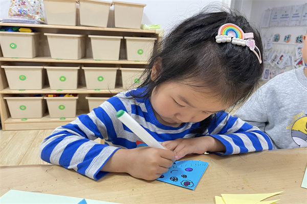 瞧,有的小朋友已经折出了扫把的雏形。一张张彩纸通过小朋友们灵巧的双手,经过了对折、压痕、抹平、修剪、填画等过程,一个个魔法小扫把就完成了。