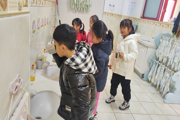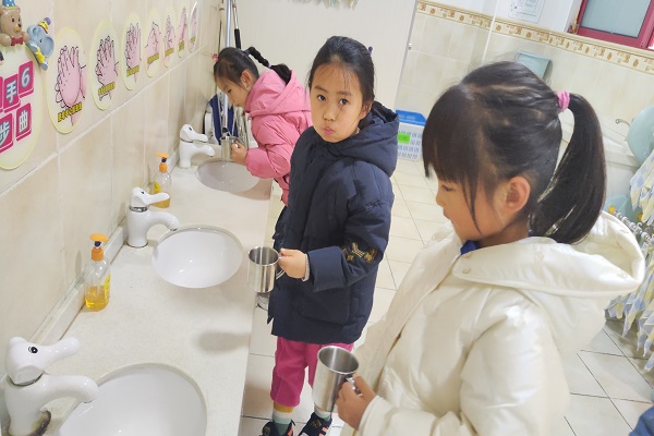 看!餐点后,小朋友们主动漱口,养成良好的口腔卫生习惯。