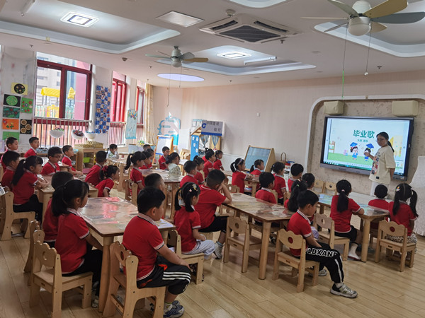 “时间时间像飞鸟,滴答滴答向前跑……”大三班小朋友还有一阵子就将迎来毕业,结束三年快乐的幼儿园生活。为此,小朋友们在孙老师的引导下用动听的歌声唱响对幼儿园生活的难忘和对小学生活的憧憬。首先,孙老师以谈话的方式导入活动,“小朋友们喜欢幼儿园吗?为什么?”孩子们你一言我一语地说着在幼儿园的难忘回忆。接下来,孙老师介绍了《毕业歌》的歌词,随后进行了范唱,引导幼儿根据音乐的旋律有节奏地朗诵歌词,启发孩子们边倾听边根据音乐的情感变化自选合适的动作和歌词相配。最后引导幼儿运用领唱、齐唱、轮唱等多种形式组织幼儿进行演唱练习。