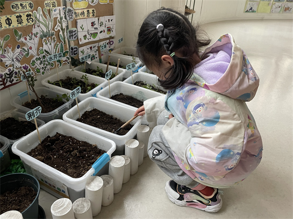 根据调查了解到春季一般可以种植百合、艾草、水芹菜、荆芥、荠菜等中草药,就此开始了草药的种植之旅。孩子们定期给植物浇水、翻土、晒太阳,有的还需要清理叶子,细心地照顾它们。每周观察草药的生长变化进行记录,快瞧,他们画地可认真了!