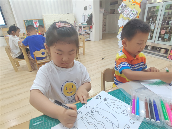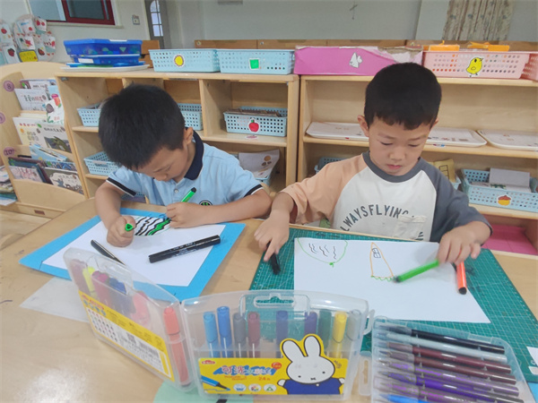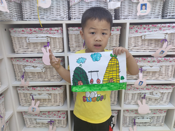 活动伊始,教师通过展示图片的形式,一个一个美味的水果变成了漂亮的房子,真的很神奇。欣赏过后我们就来创造属于我们自己的房子吧!孩子们拿着绘画工具认真作画,就像一个个“小画家”一样,充分发挥自己的想象力,用稚嫩的小手挥动手中的画笔大胆作画,很快形态各异、姿态万千的水果屋跃然纸上。