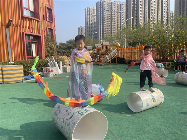 在简单的热身活动之后,老师强调过了要求和规则,大五班的宝贝们便四散开来挑选自己感兴趣的材料,迫不及待地开始自由探索之旅。通过之前的熟悉体验加上现在的探索练习,已经会走滚筒的宝贝们再次升级了游戏难度,从简单的一人走变成了双人走,交换走等游形式,甚至还有的宝贝穿上了漂亮的衣服,拿上华丽的道具配合着动感的音乐,尝试在滚筒上跳起了舞!