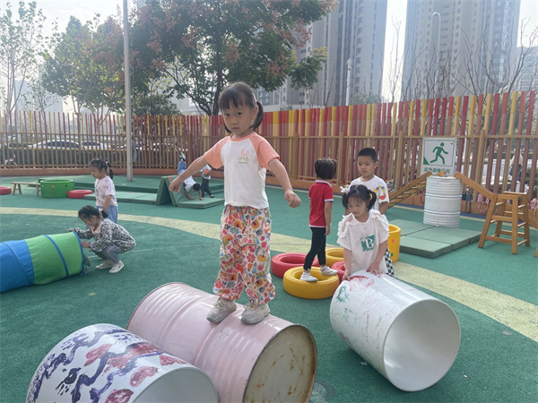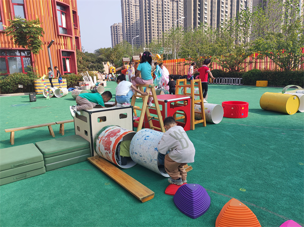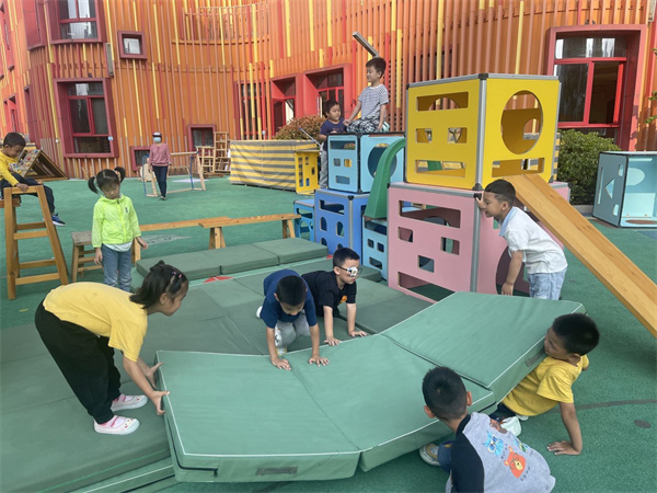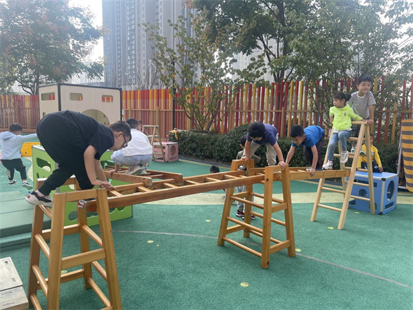 那不会走怎么办呢?这一边的宝贝们经过讨论,在拿到最熟悉的滚筒、爬梯、木板等材料后兴奋地说道:“快来!我们一起搭建一个独木桥赛道吧!”“这里可以放一个木板,就变成了滑梯啦!”“看,这是我搭建的跳台!”……每个人都创意满满,自由设计,很快一个大型赛道出现了场地中央。