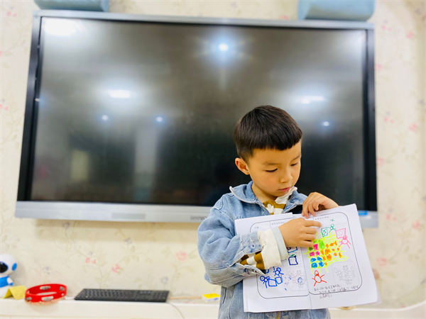 在分享表征环节,孩子们用稚嫩的语言进行游戏表述,讲述游戏中遇到的问题与解决方法,为下次游戏积累经验,这也是“经验”内化成“知识”的过程。孩子们的画作或许让大人们无法理解,但是通过语言的表达,会“恍然大悟”一个完整的故事呈现,你会讶异于孩子们的游戏童趣和奇思妙想。