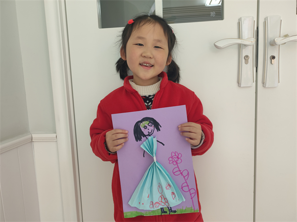 看,是什么吸引了孩子们的目光?原来是一条美丽的连衣裙。在小朋友们期待的目光,陶老师对连衣裙的制作步骤进行了一一演示。准备好材料,小朋友们迫不及待地开始了:巧手翻飞纸张在指尖跳舞,小剪刀灵动的剪裁,五彩画笔创意的图画……不一会儿,好看的连衣裙大功告成了。有的小朋友想把美丽的连衣裙送给自己,也有的小朋友开心地要把连衣裙作为礼物送给妈妈、外婆、奶奶……每一条裙子都有着孩子们独一无二的设计灵感。
