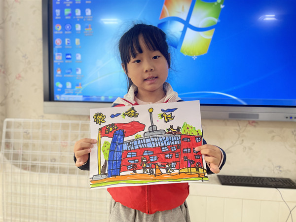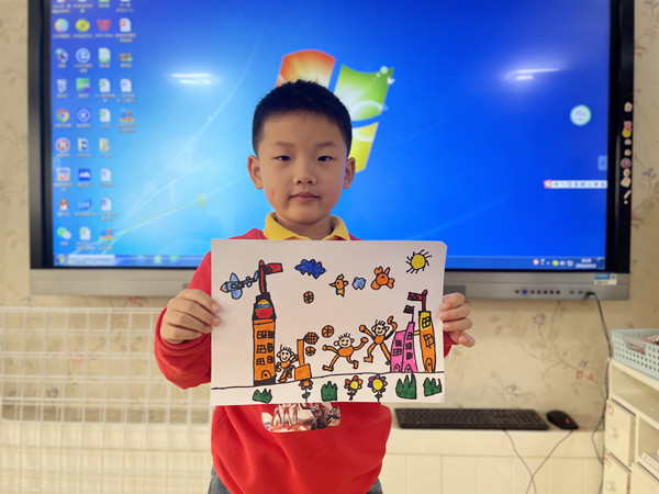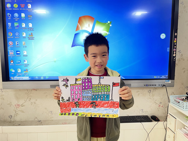 孩子们用稚嫩的小手涂鸦了一张张可爱的笑脸:有的用七彩油画棒画了小朋友们一起做游戏的画面,有的用蜡笔描绘出一面庄严肃穆的国旗,用水粉勾勒出心目中小学,还有点用线笔勾画出对未来世界的期望……绘画内容丰富多彩,画风多样、形象生动,洋溢着浓浓的童趣。