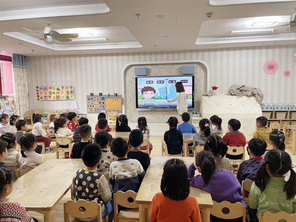 活动开始,教师通过展示图片、播放视频导入活动主题。幼儿仔细观看安全教育视频后,教师组织幼儿讨论了关于传染病的发生、传播和预防。师幼一起学习儿歌“勤洗手,多通风,空气流通最重要。不贪嘴,勤锻炼,健康饮食身体好。叫戴口罩你就戴,你是防疫小可爱,勤洗小手多喝水,你是听话小宝贝。饭前便后要洗手,卫生习惯要优良。生吃蔬菜与瓜果,洗净削皮不能忘。你拍一,我拍一,减少外出要牢记。你拍二,我拍二,转告亲人和伙伴”。