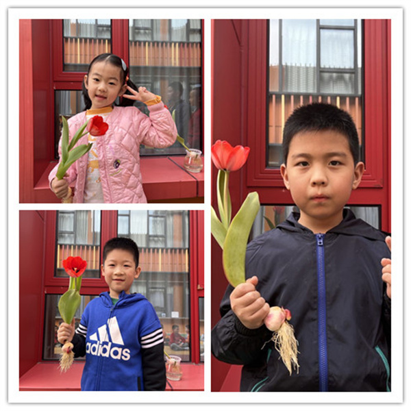 “它长得好像大蒜。”最开始水培的时候孩子们不由感慨。为了让孩子们更好的了解郁金香,老师们带领幼儿观察了郁金香种球,并通过视频了解了郁金香的生长过程。接着满怀期待的孩子们亲手将种球小心翼翼放进瓶子里,并插下自己的专属标签。随后,孩子们每天提来小桶为郁金香浇水。它的花会是什么颜色的呢?孩子们充满了期待,随着最近的温度升高了,很快郁金香开出了玫红色的花,孩子们十分的激动,怎么能留住郁金香的美丽呢?孩子们提议,一起与开放的郁金香来个合影吧!于是孩子们选了一朵最好看的郁金香与它合影,留住这个美好的瞬间。 郁金香的花期不是很长,开了一段时间后花茎就开始枯萎了,孩子们在老师的引导下决定在花开始掉落的时候,将掉落的花瓣用来做永生花,期待着孩子们做的郁金香永生花。大一班小朋友与郁金花的相遇这才慢慢开始哦!